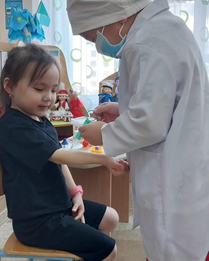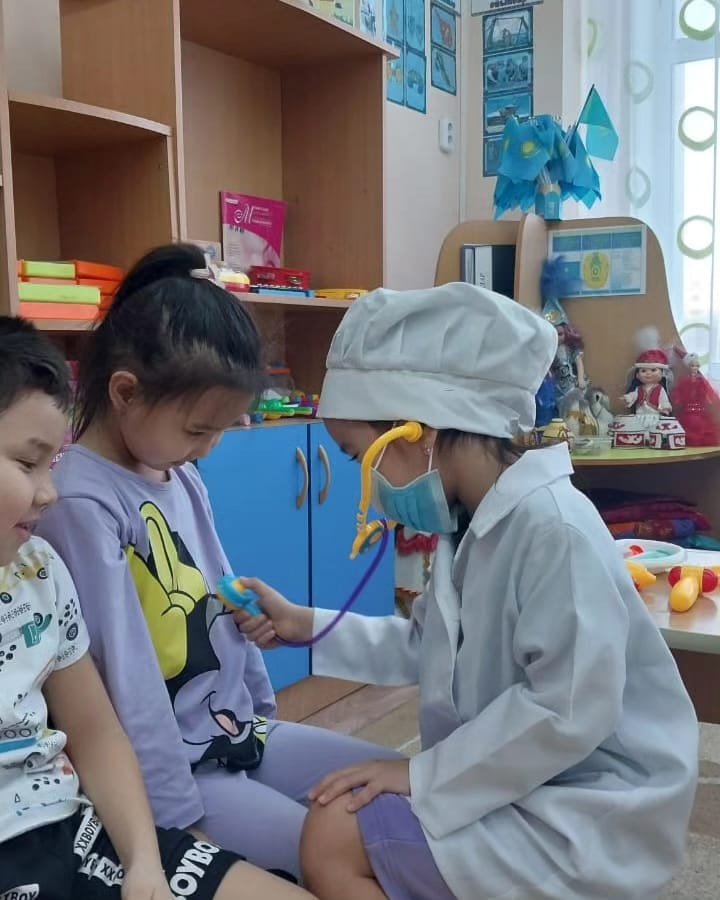 тіс дәрігері, сынықшы, хирург...👩🏻⚕️Айта берсек өте көп💫Балалар дәрігердің арнайы киімдерін киіп, бір-біріне дәрігердің жасайтын қызметтерін жасады. Бір бала сынықшы болса, екіншісі дәрі егумен айналысты,басқасы тіс дәрігері болды. Балалар ауырғанда дәрі беретін,емдейтін апайлар мен ағайлар "Дәрігер"👩🏻⚕️екенін білді. Балалар өте керемет әсерде қалды.