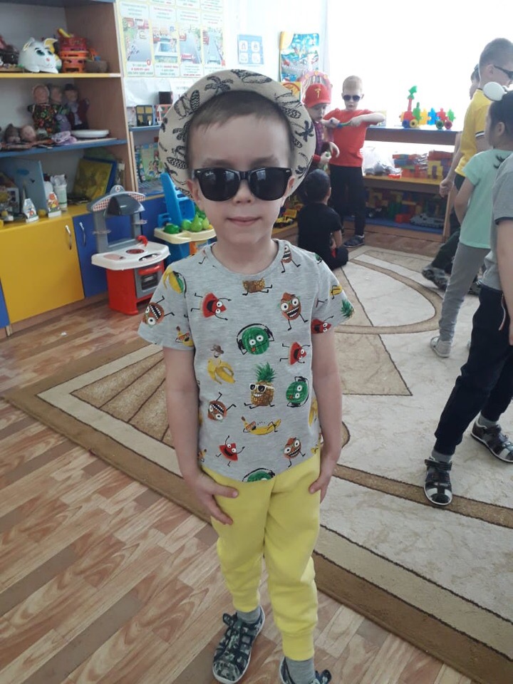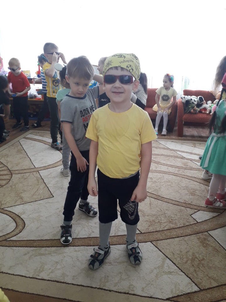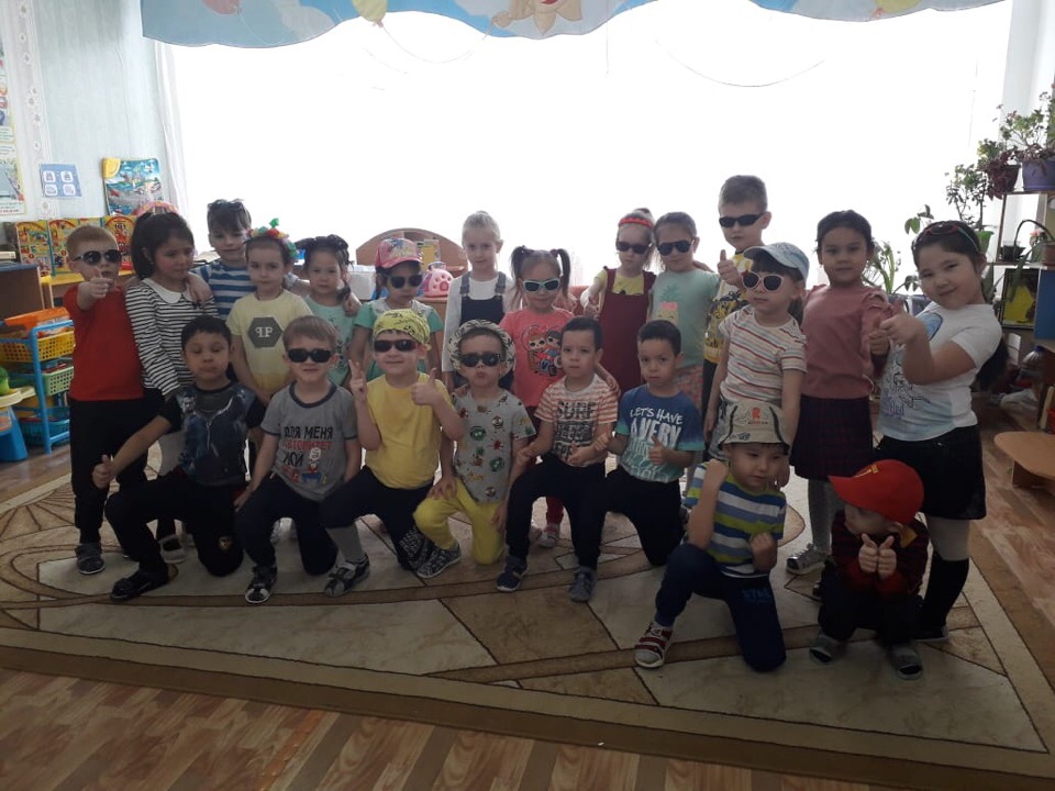 Все дети пришли в летней яркой одежде (Аксессуары: очки, панамки, кепки, шляпы ).