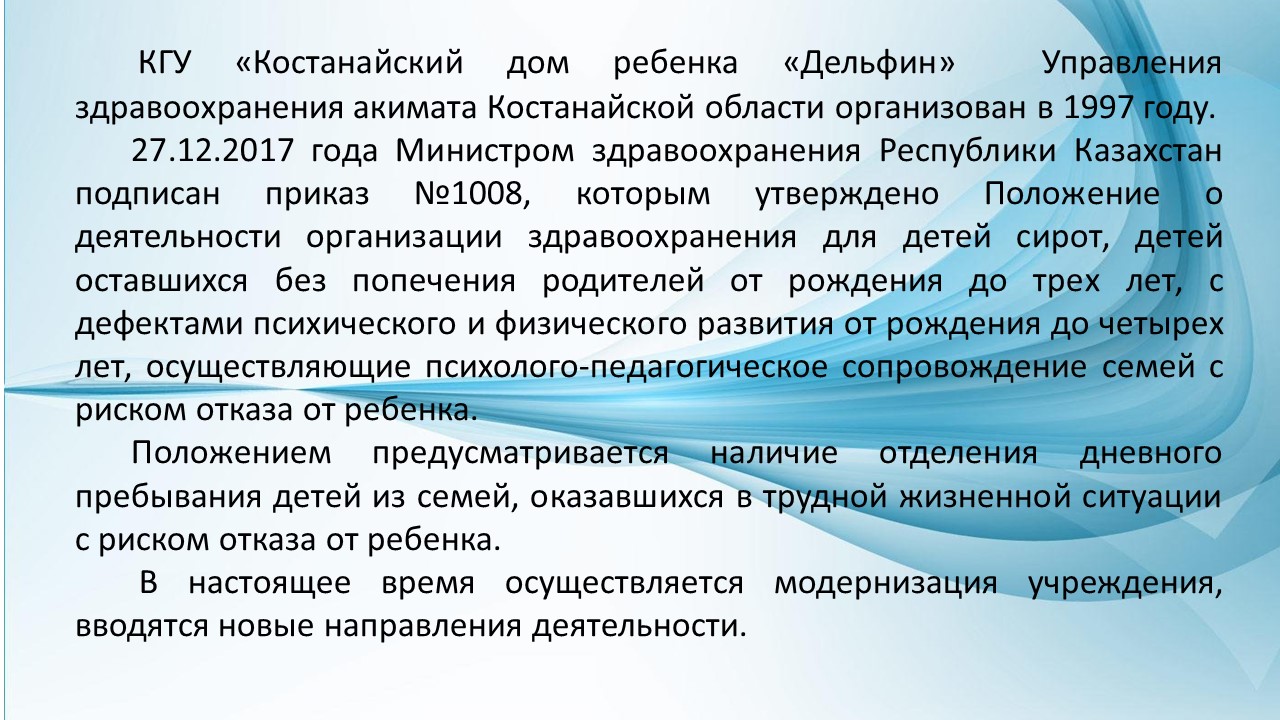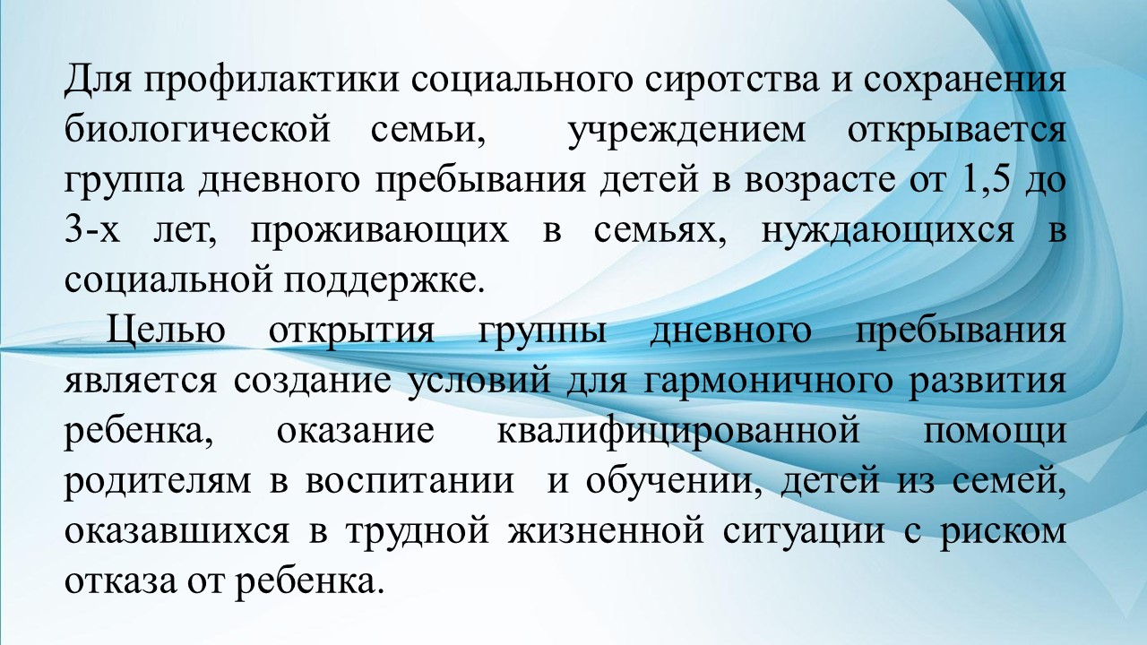 Для профилактики социального сиротства и сохранения биологической семьи, в Доме ребенка «Дельфин» с 1 марта 2022 г. работает группа дневного пребывания детей в возрасте от 1,5 до 3-х лет, проживающих в семьях, нуждающихся в социальной поддержке.