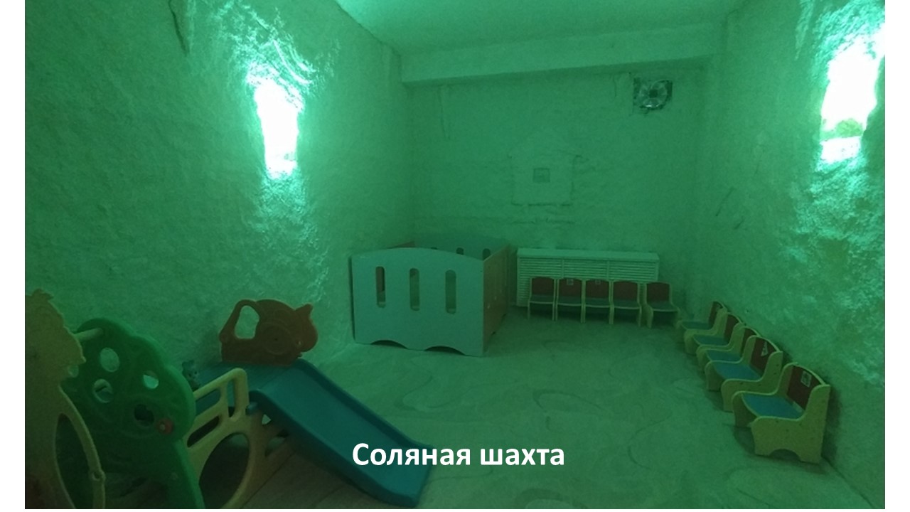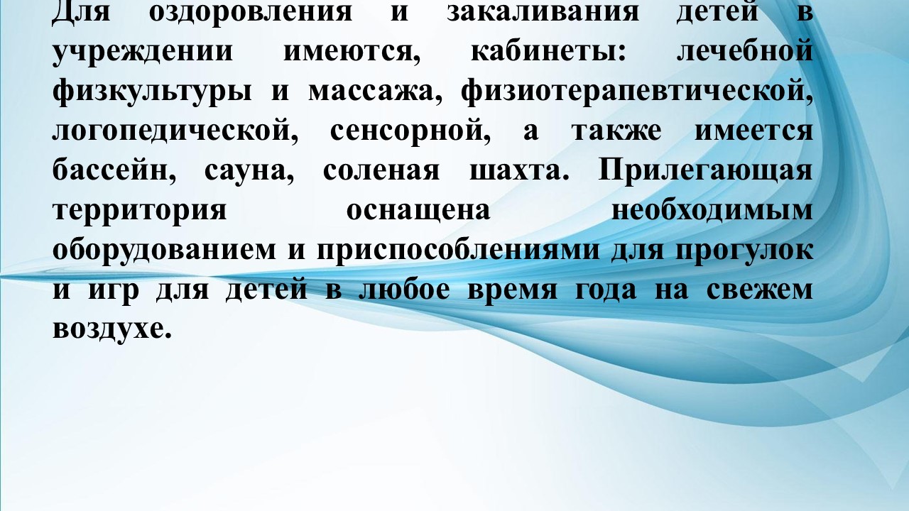 Для оздоровления и закаливания детей в учреждении имеются, кабинеты: лечебной физкультуры и массажа, физиотерапевтической, логопедической, сенсорной, а также имеется бассейн, сауна, соленая шахта. Прилегающая территория оснащена необходимым оборудованием и приспособлениями для прогулок и игр для детей в любое время года на свежем воздухе.