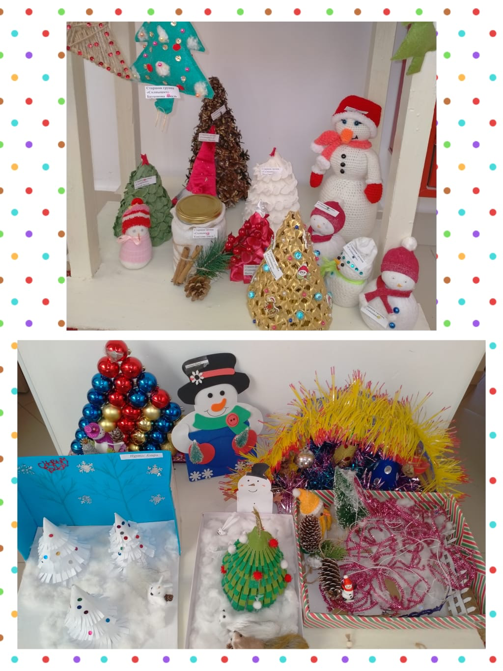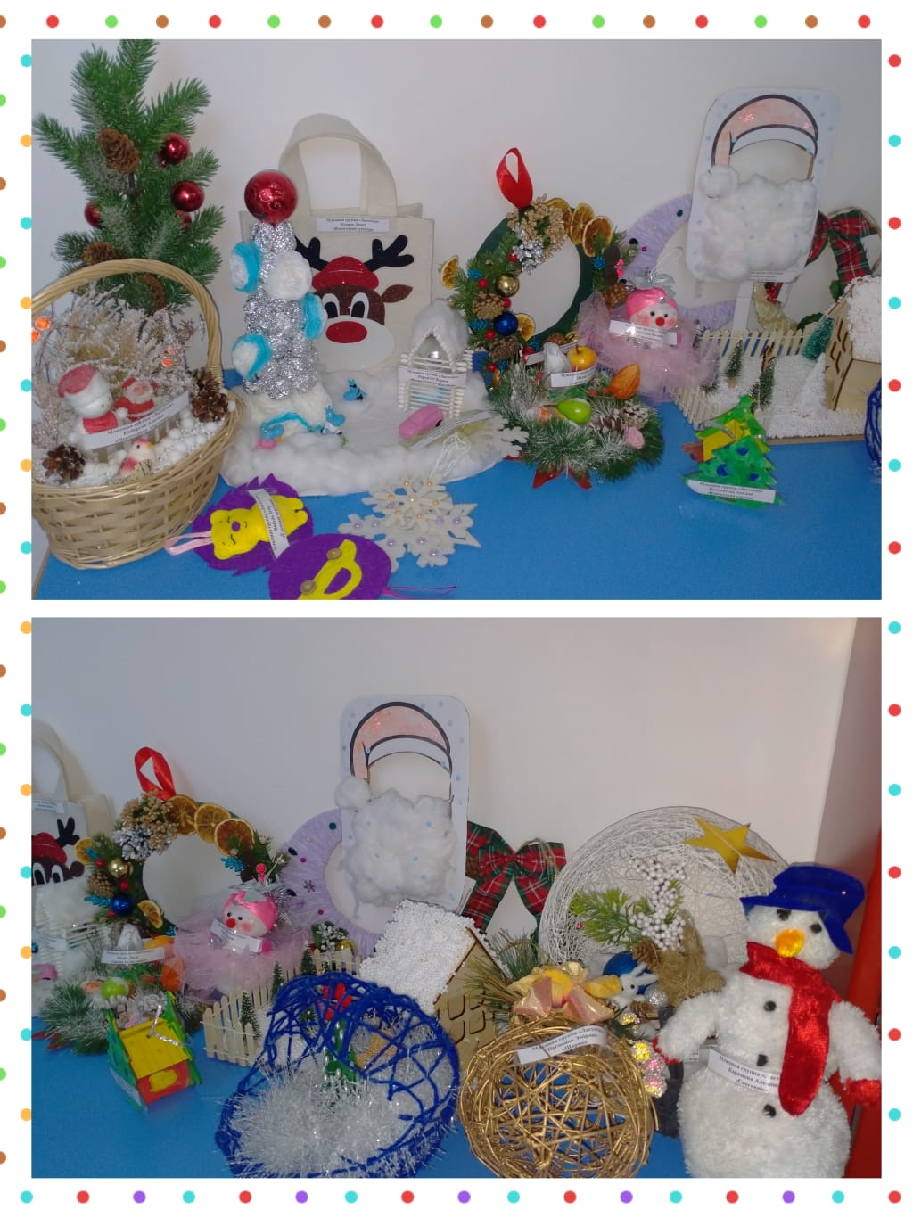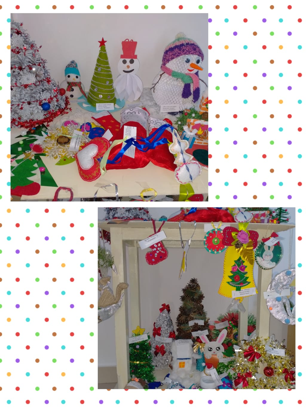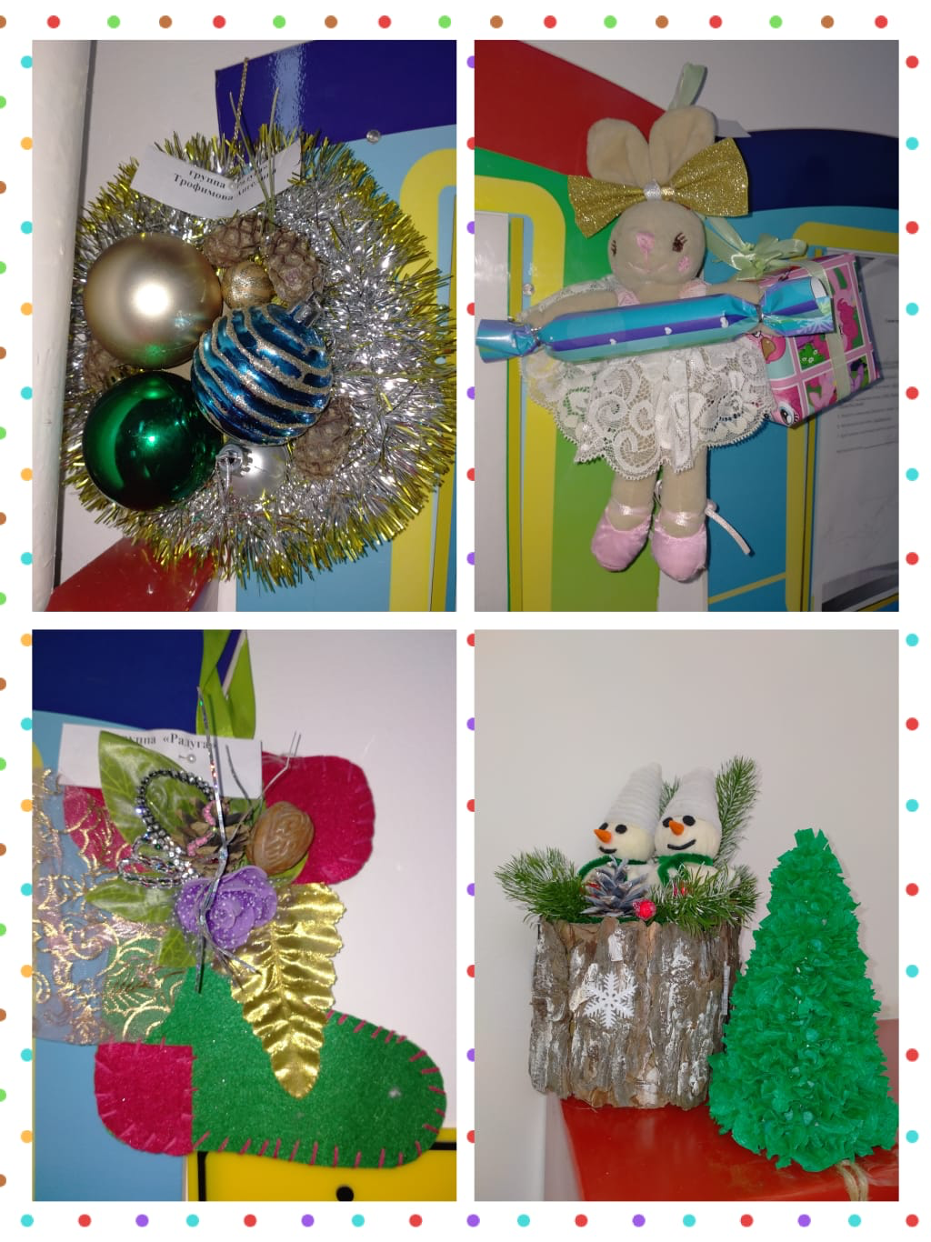 Сколько чудесных игрушек украсили нашу выставку! Ёлочные шары, весёлые снеговики, снежинки, хлопушки, Дед Мороз и конечно символ года - Заяц… Всего не перечислить! Всё пошло в ход и атласные ленты, и ватные диски, и шишки, и бусинки, и бисер и многое другое. Все работы получились интересными и красочными, фантазии маленьких умельцев и их родителей не было предела. Все старались проявить нестандартность в творческом порыве, сплочённость при совместном труде.