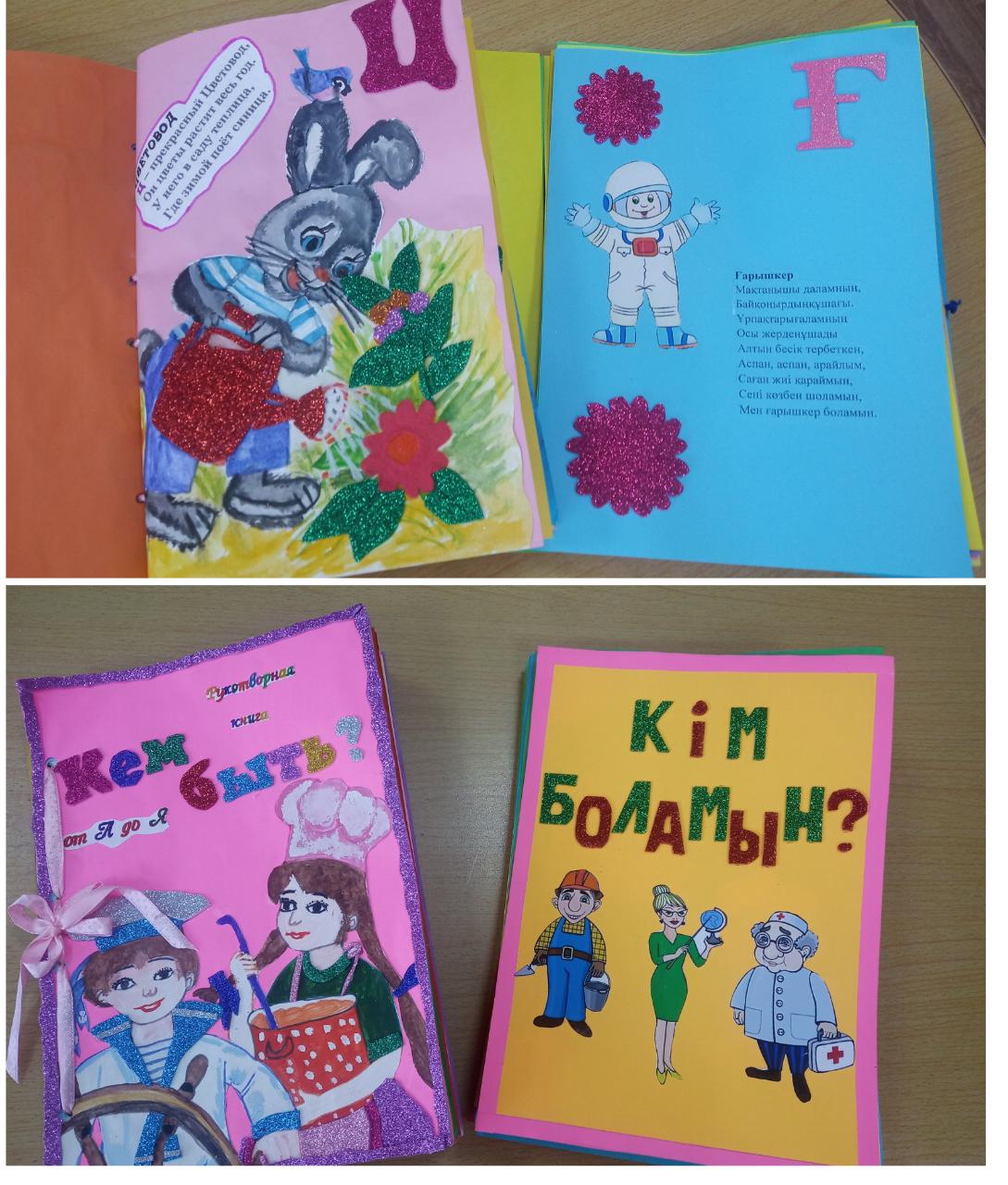 Изготовлена рукотворная книг «Кем быть» (профессии от А до Я) на двух языках: казахском и русском с целью применения ее в организованной деятельности детей и активизации познавательной деятельность дошкольников. |