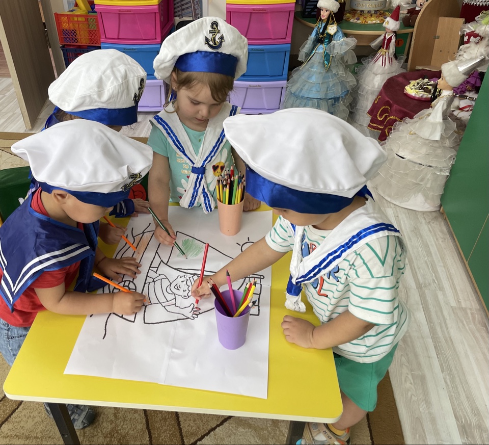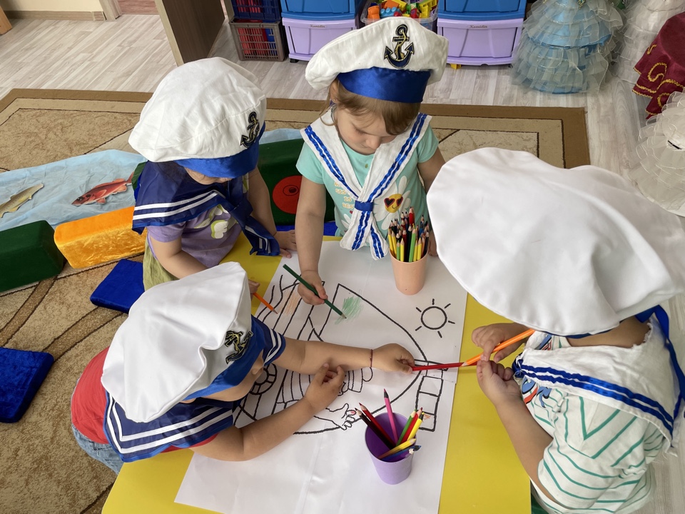 🚢🚢🚢 Воспитанники младшей группы отправились в морское путешествие на корабле, который построили сами вместе с воспитателем (борт корабля, на палубе разместили штурвал, установили трап, якорь, места для пассажиров). Воспитанники договорились, кто кем будет, переоделись в моряков и с удовольствием отправились в дальнее плавание. Все хотели побыть отважным капитаном корабля и постоять за штурвалом. Во время путешествия команда моряков посетила почту (забрать письма, передать привет своим близким), больницу (проверили свое здоровье), раскрашивали рисунок на морскую тематику.