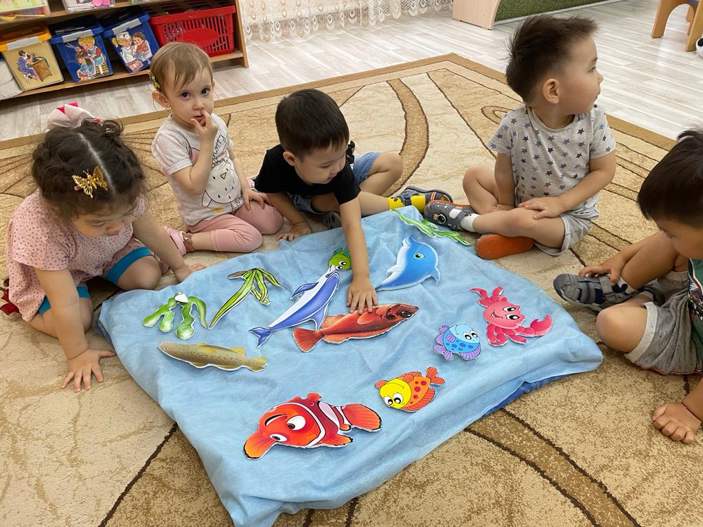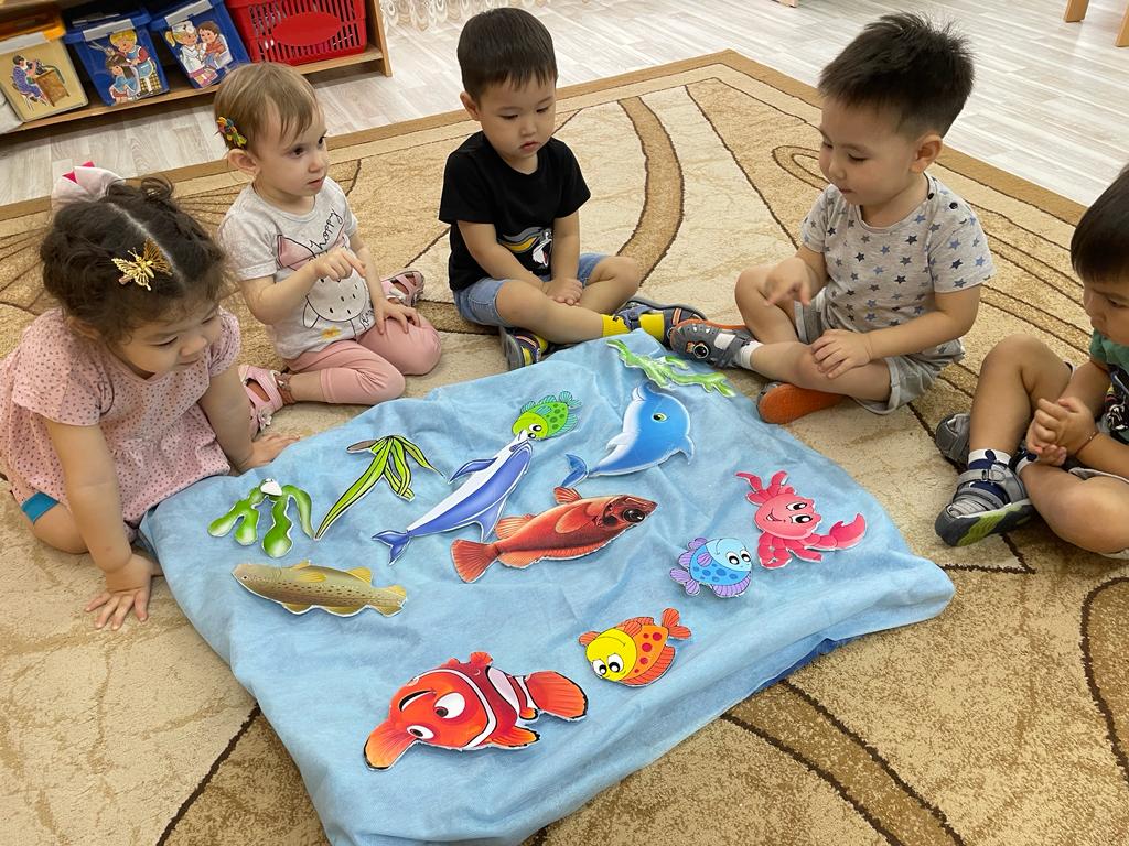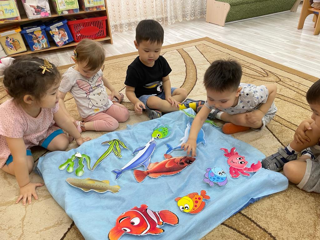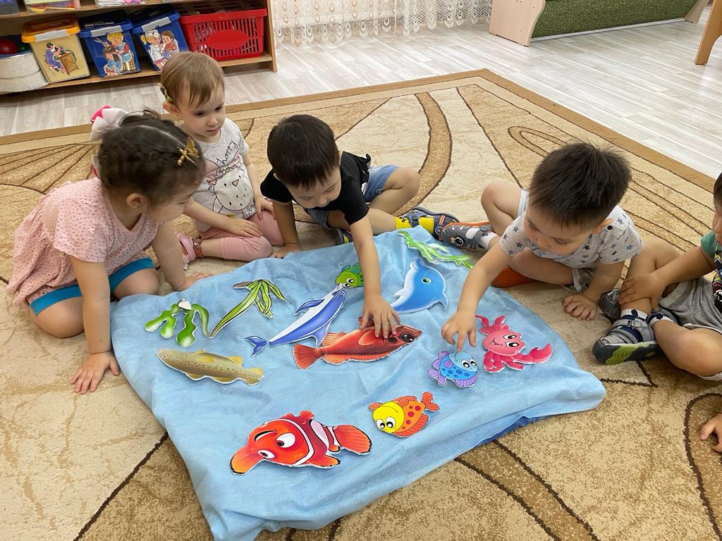 В рамках реализации программы экологического воспитания в младшей группе Радуга , проведено мероприятие "Подводный мир". Целью стояло перед нами познакомить малышей с понятием, что такое море и морские обитатели. Большое значение имеет у малышей тактильный контакт, мы используем игрушки. Игрушки рыбы позволяют мысленно различать, сравнивать поверхность, строение рыбок. Контакт пальчиками с игрушками тесным образом связан и с развитием речи малышей. Шум моря позволил детям как можно реалистичнее представить подводный мир.