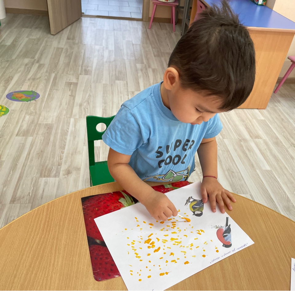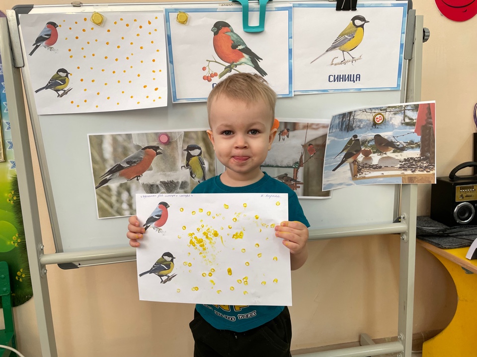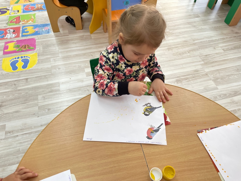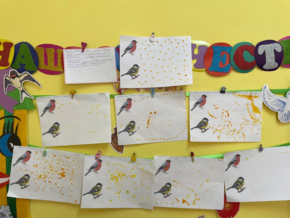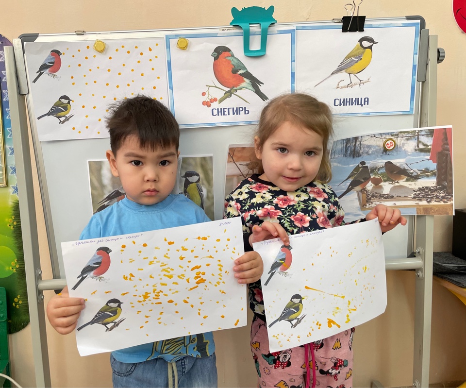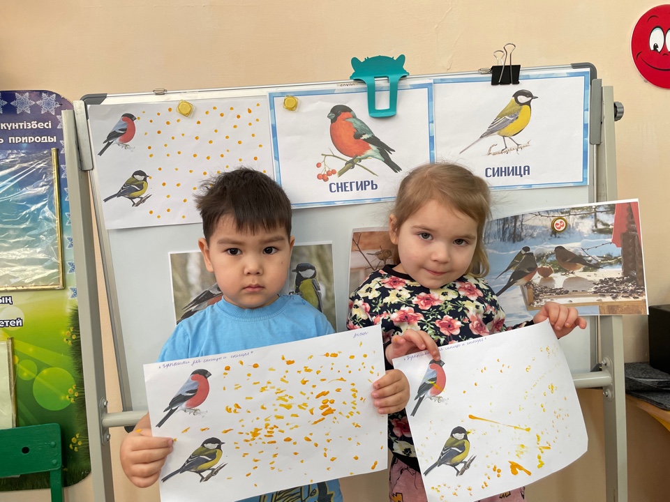 В рамках реализации экологическое воспитание детей в ГККП "Ясли-сад№3" в младшей группе "Радуга" мы стараемся пробуждать в детях интерес к живой природе, воспитываем любовь к ней, учим беречь окружающий мир. Бережное отношение к природе необходимо воспитывать у малышей с раннего возраста. В холодное время года воспитываем желание помогать нашим братьям меньшим, к птицам в трудное для них время. Создать необходимые условия в группе по формированию целостного представления о жизни зимующих птиц. У детей недостаточно знаний о зимующих птицах и нет навыка в умении подкормки птиц в зимнее время года. Мы предложили нашим детям покормить наших птиц зернышками, нарисованными самими малышами. Воспитатели: Ишбулдина Г.Н., Каримова Н. Х.